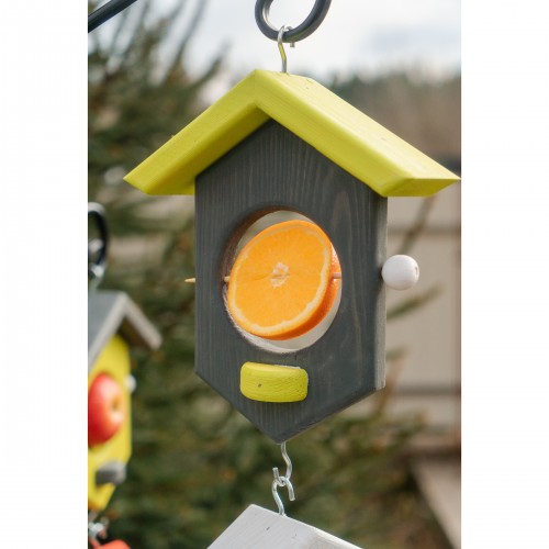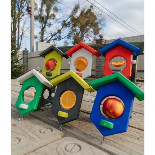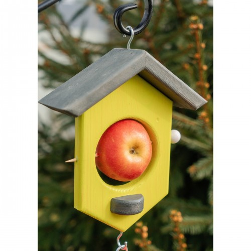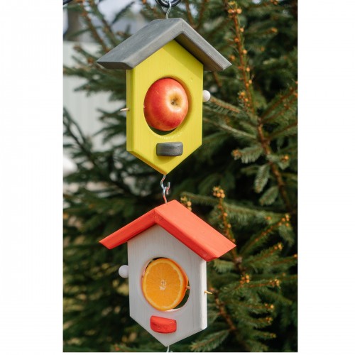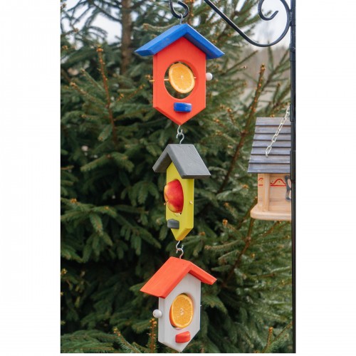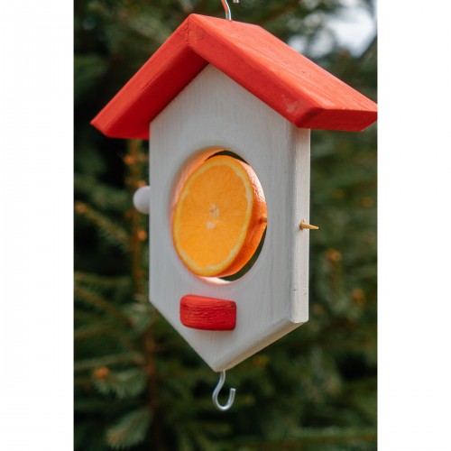 Підвісна годівниця виготовлена з дерева, оброблена спеціальними фарбами, що додають деревині стійкості до атмосферних явищ.
