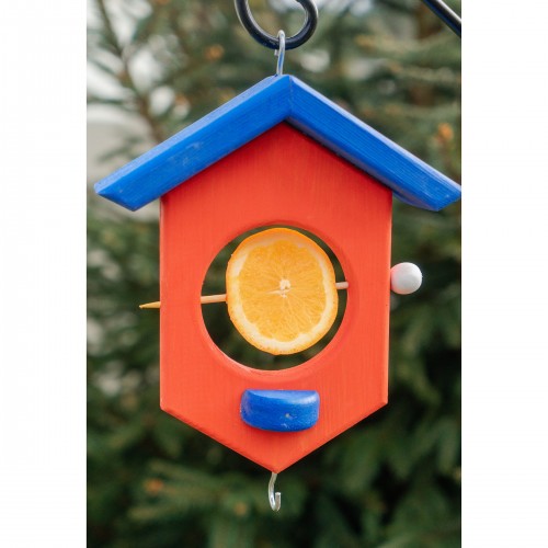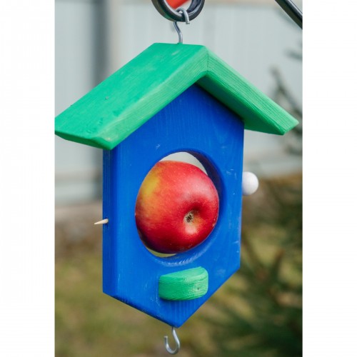 Підвісна годівниця виготовлена з дерева, оброблена спеціальними фарбами, що додають деревині стійкості до атмосферних явищ.