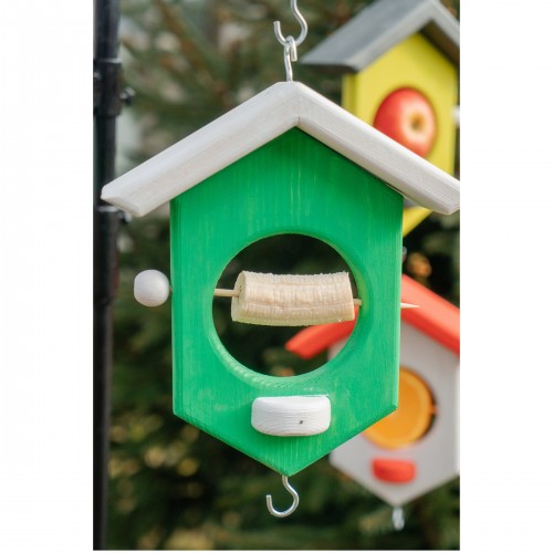 Підвісна годівниця виготовлена з дерева, оброблена спеціальними фарбами, що додають деревині стійкості до атмосферних явищ.
